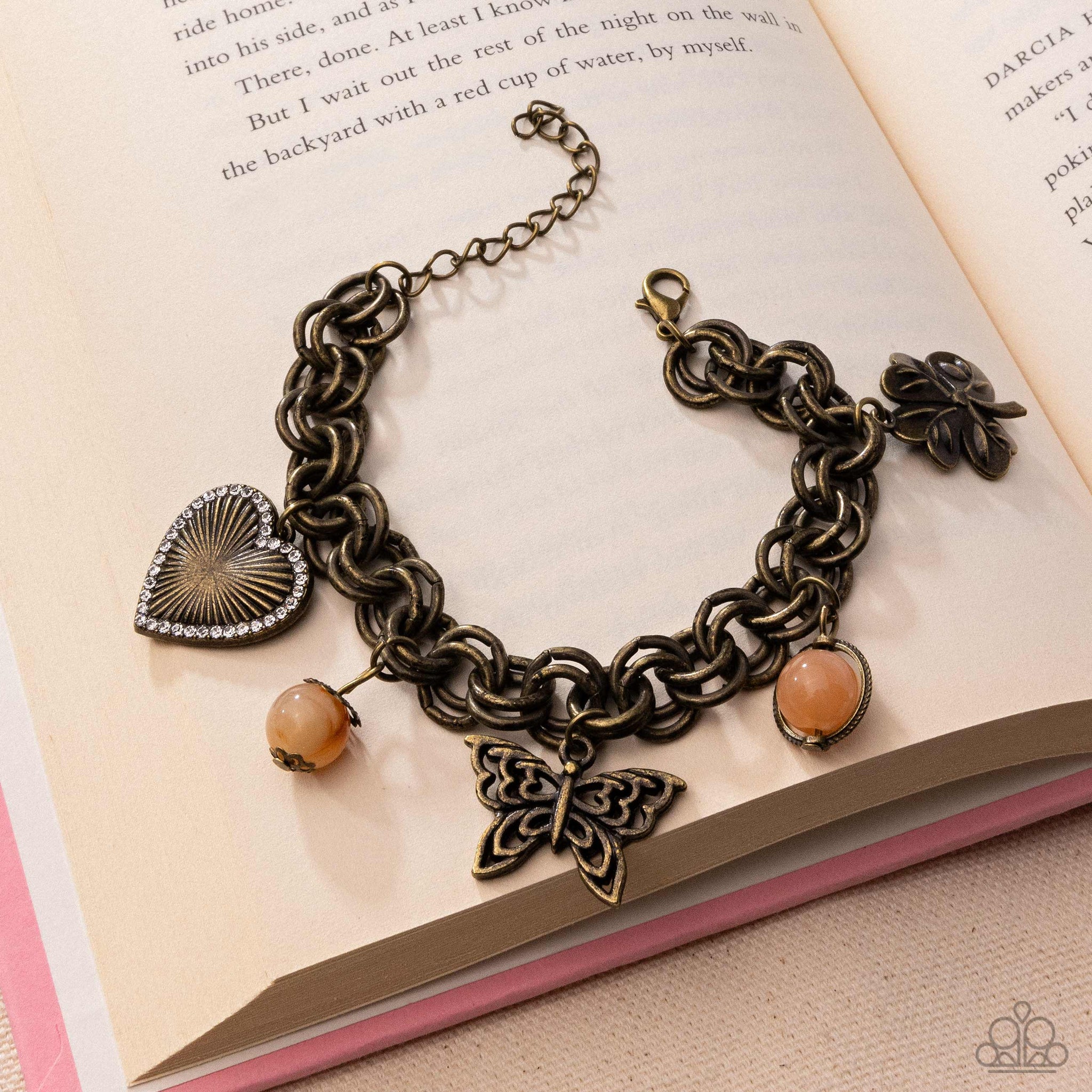 An antiqued brass chain features a collection of whimsical charms, including a brass four-leaf clover, a brass butterfly, a textured brass heart outlined in white rhinestones, and two marbled orange stones. The eclectic combination of charms adds a playful and vintage-inspired touch. Features an adjustable clasp closure.