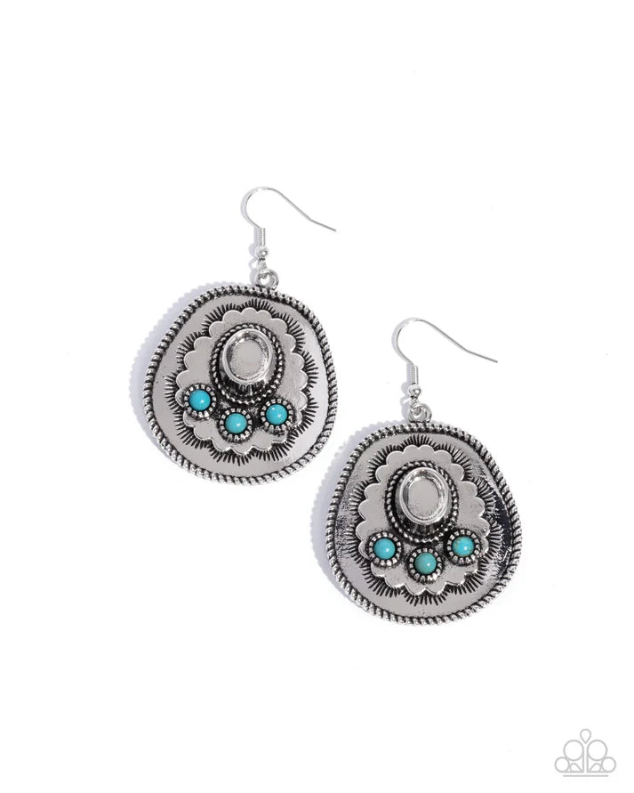 Studded across the top of an intricately stamped and detailed silver cowboy hat, a trio of turquoise stones glistens for a Southwestern-inspired statement. Earring attaches to a standard fishhook fitting. As the stone elements in this piece are natural, some color variation is normal.