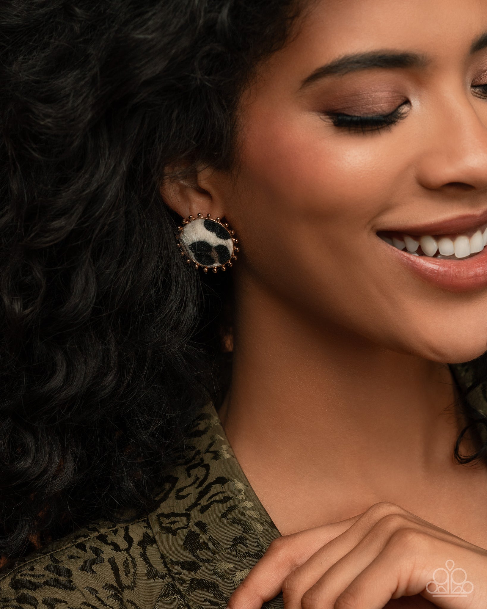Featuring a gold-studded border, a brown multicolored cow-printed material stands out atop the ear for a whimsically Western look. Earring attaches to a standard post fitting.