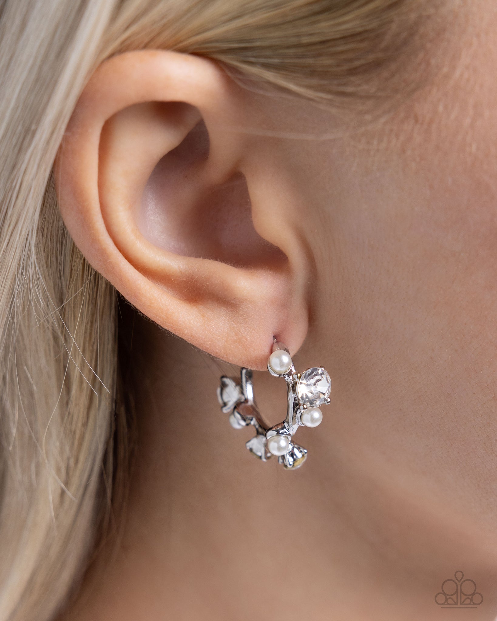 Set in elevated silver fittings, a collection of glossy white pearls and faceted white gems shimmer and shine around the ear for a dazzling, dainty display. Earring attaches to a standard post fitting. Hoop measures approximately 5/8" in diameter.