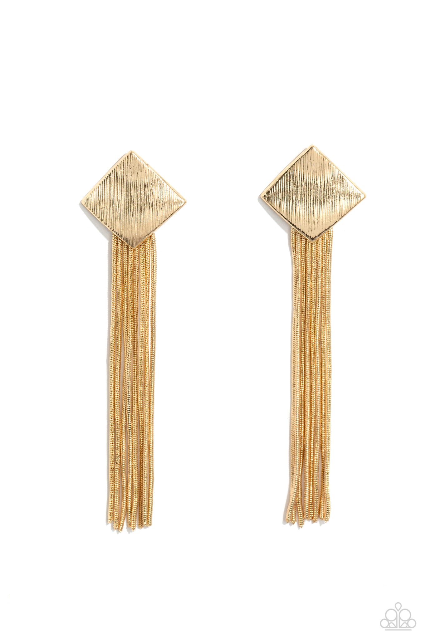 A curtain of rounded gold snake chains stream out from the bottom of a scratched gold frame, creating an edgy tassel. Earring attaches to a standard post fitting.