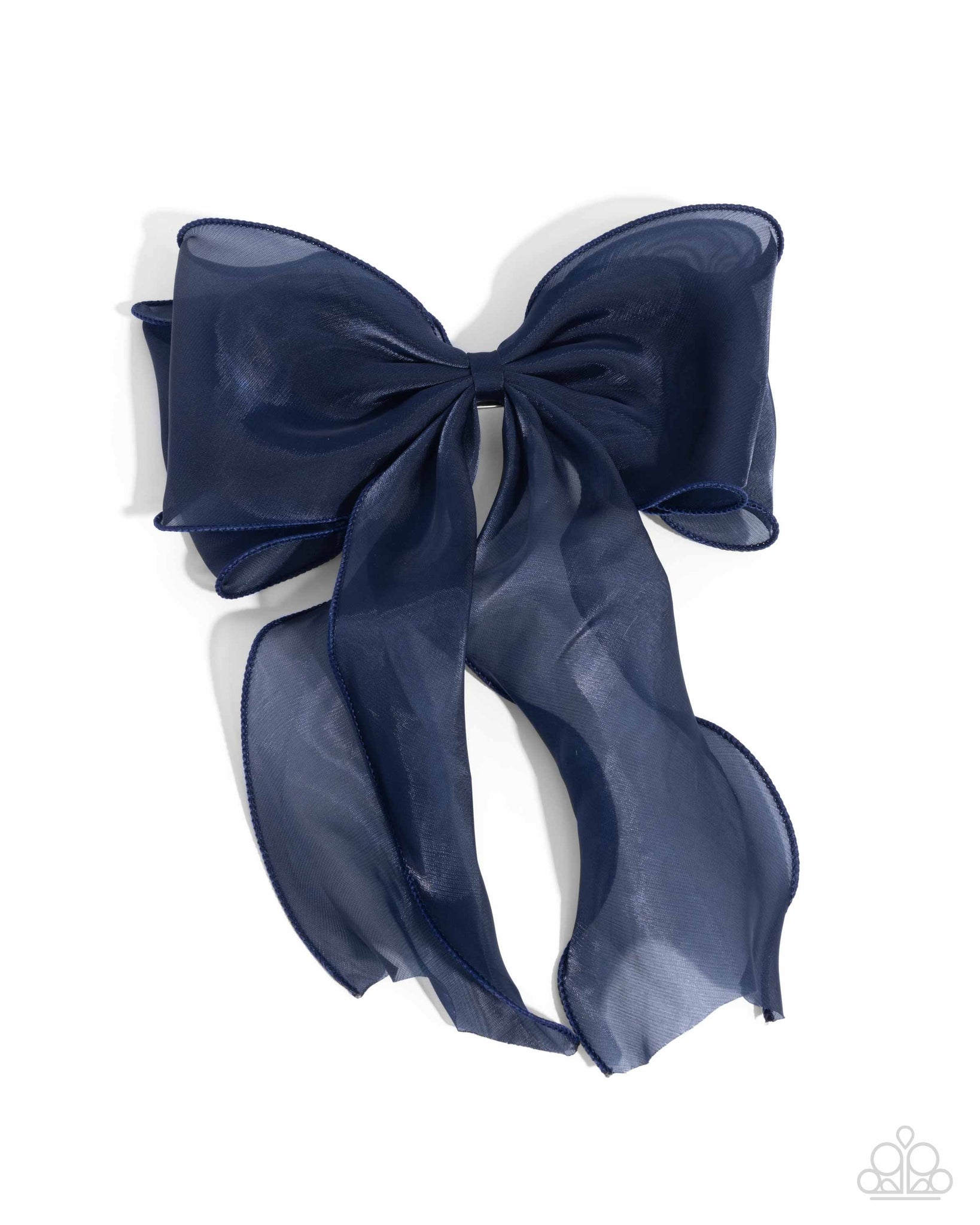Featuring a sheer navy blue ribbon, an oversized bow loops together in an elegant silhouette. Features a standard hair clip on the back.