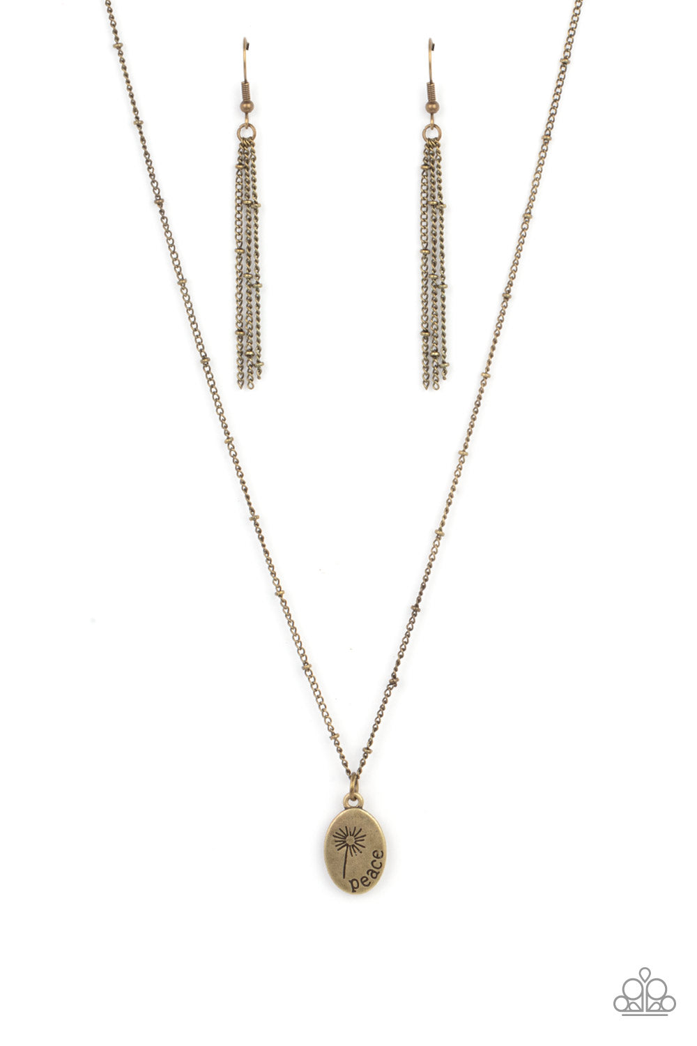 Featuring a blooming dandelion, a rustic brass disc is stamped in the word, "Peace," creating a whimsical pendant below the collar. Features an adjustable clasp closure.