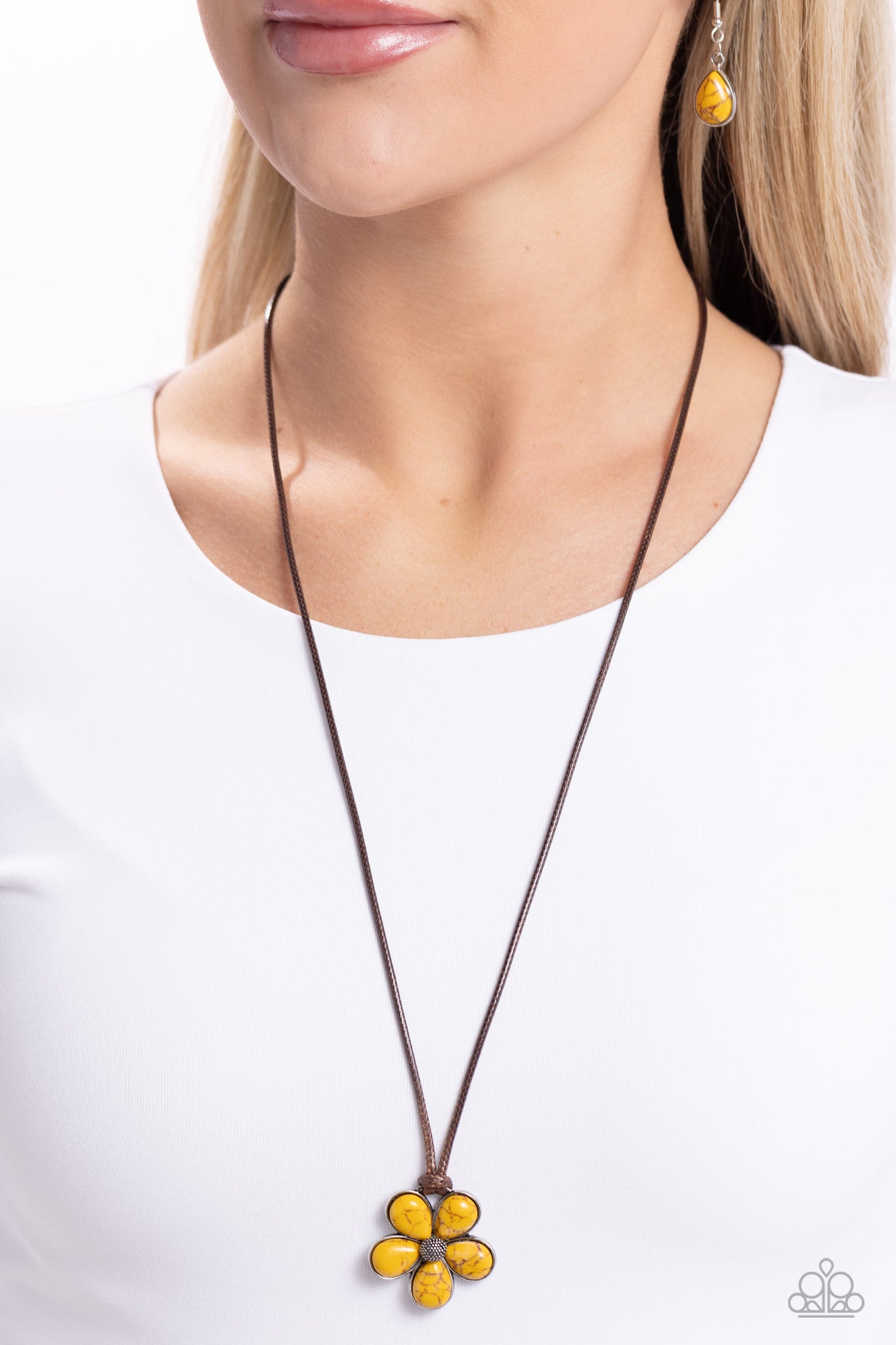 Fluttering from a brown cord, an oversized flower with yellow stone petals blooms around a studded silver center for a pop of earthy color. Features an adjustable clasp closure. As the stone elements in this piece are natural, some color variation is normal.