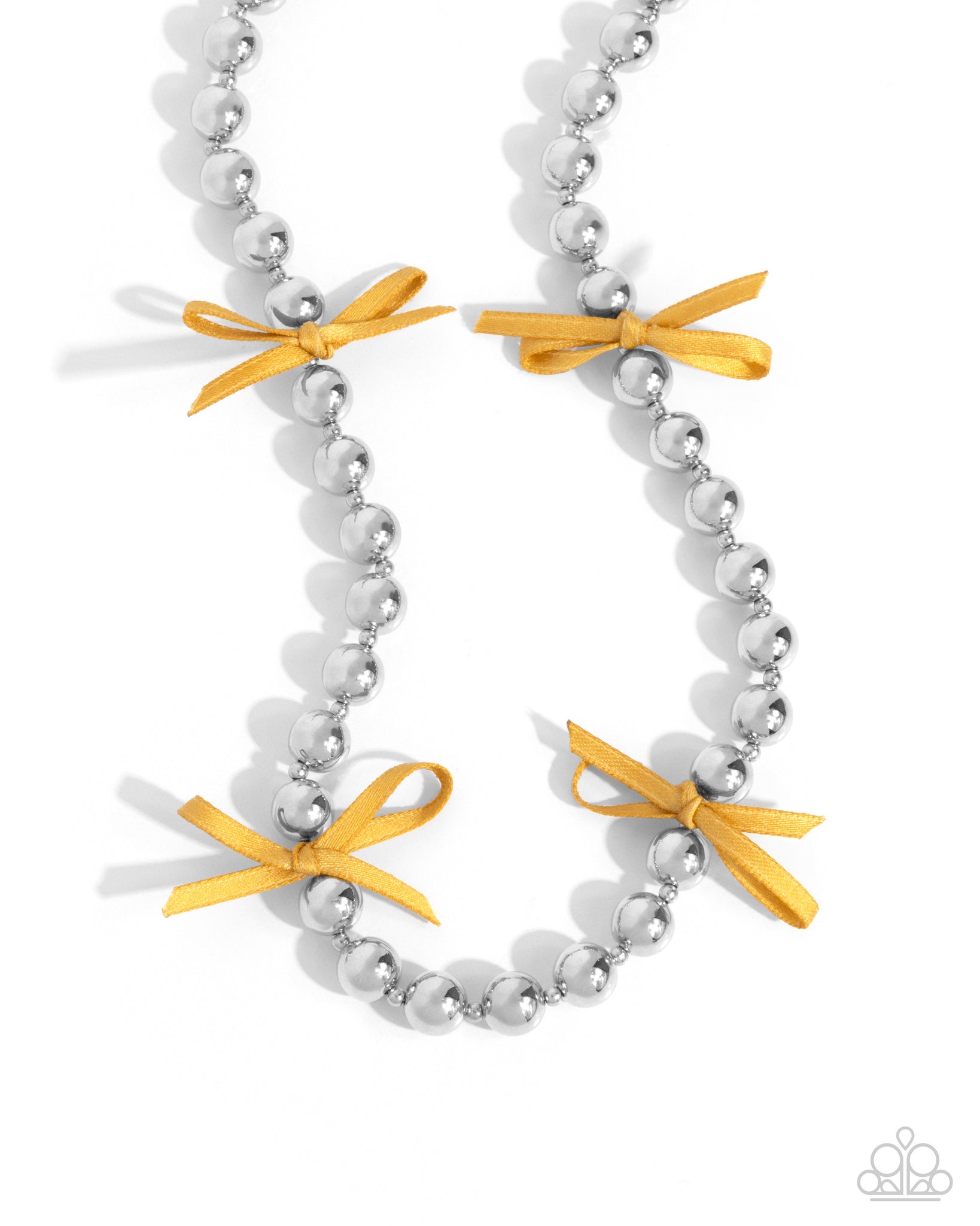 Infused with dainty silver studs, a bubbly collection of oversized silver beads cascades below the chest for a timeless display. A quartet of Golden Palm ribbons sporadically interrupt the beaded display and are tied below the collar for a refined finish. Features an adjustable clasp closure.