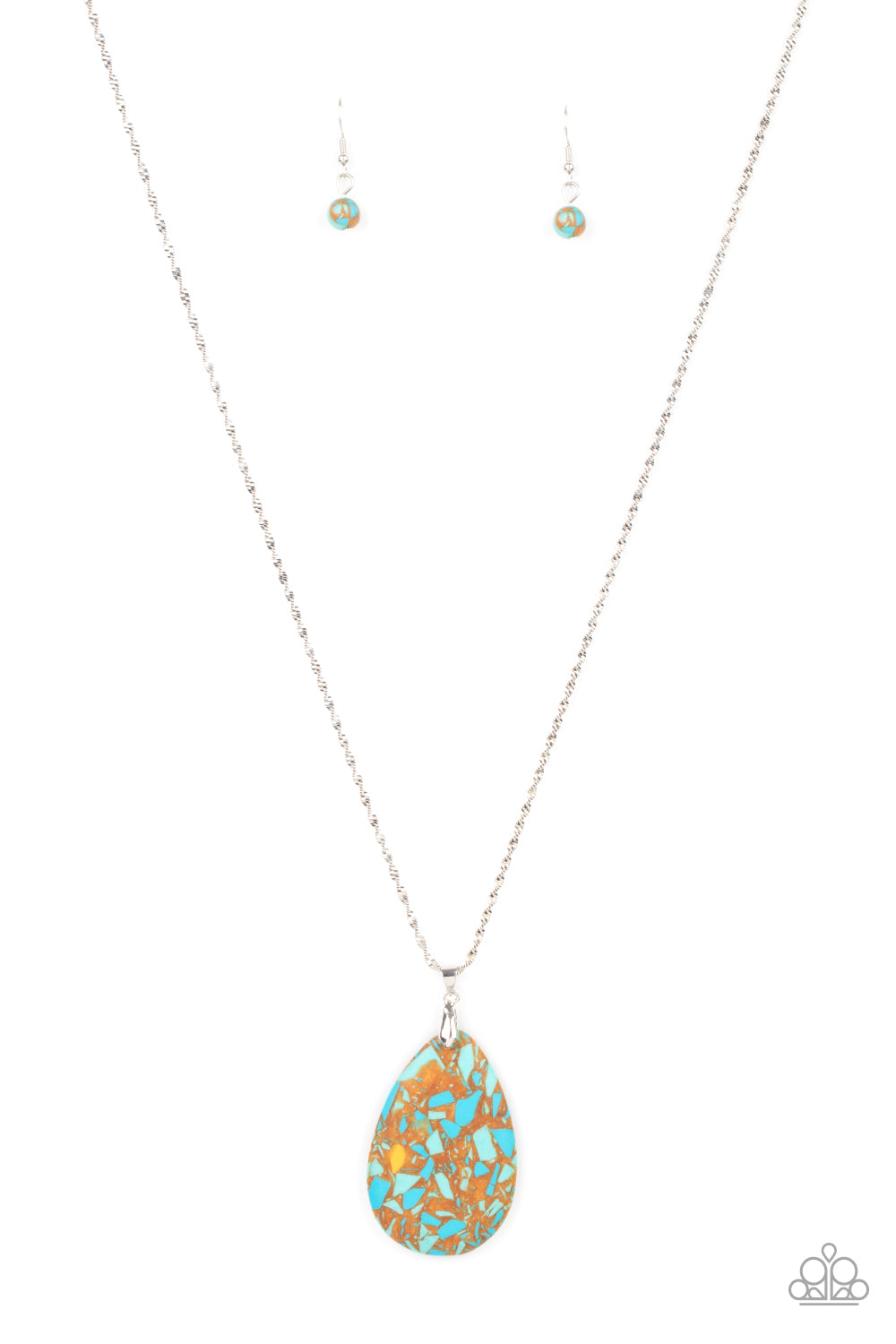 Featuring a terrazzo pattern, a speckled stone teardrop swings from the bottom of an ornately twisted silver chain for an earthy inspiration. Features an adjustable clasp closure.