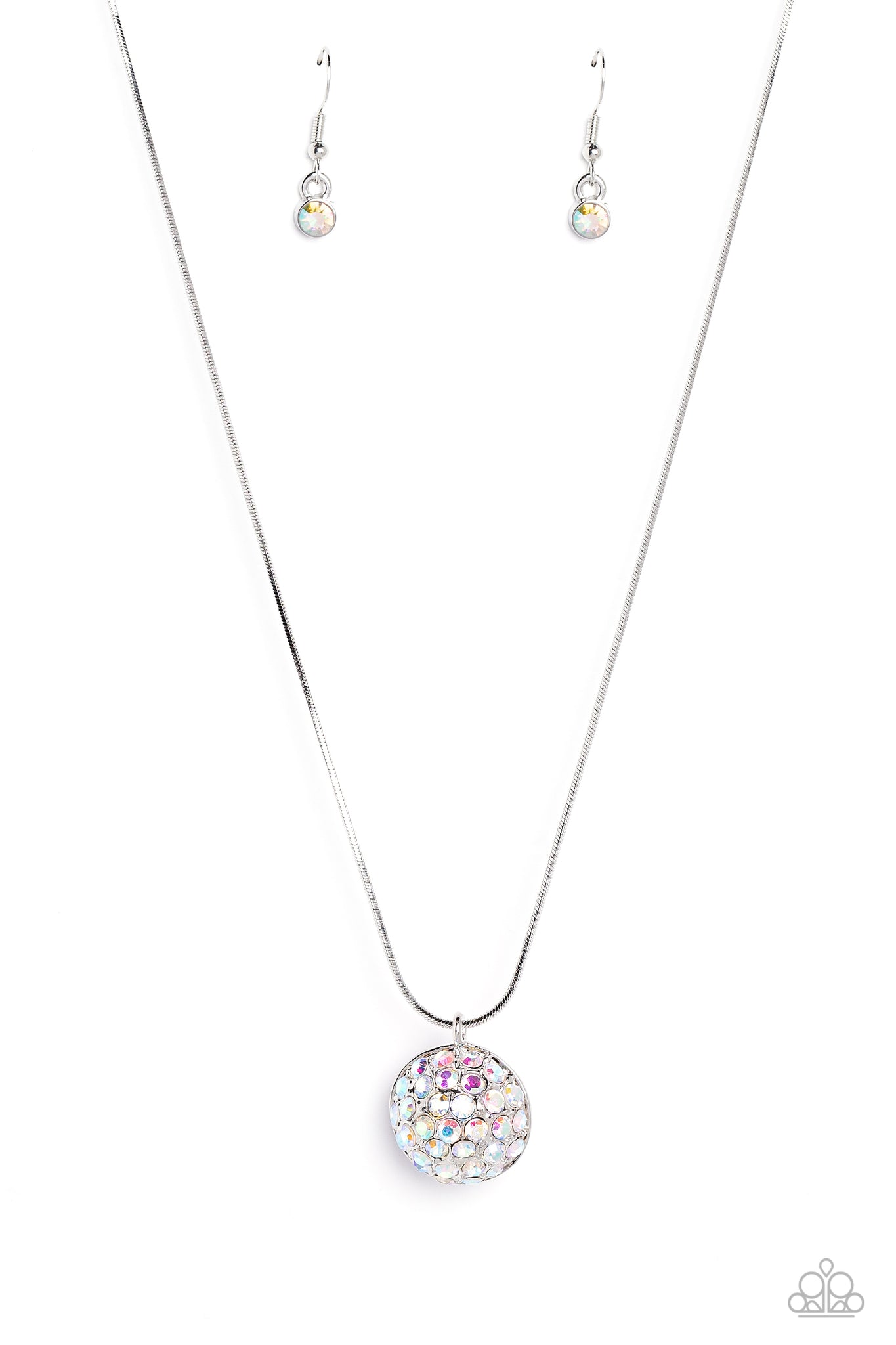 Cascading from a shiny silver snake chain, a sparkly iridescent rhinestone-encrusted ornament and a classic baby pink pearl meet to create a half-and-half refined pendant. Features an adjustable clasp closure. Due to its prismatic palette, color may vary.