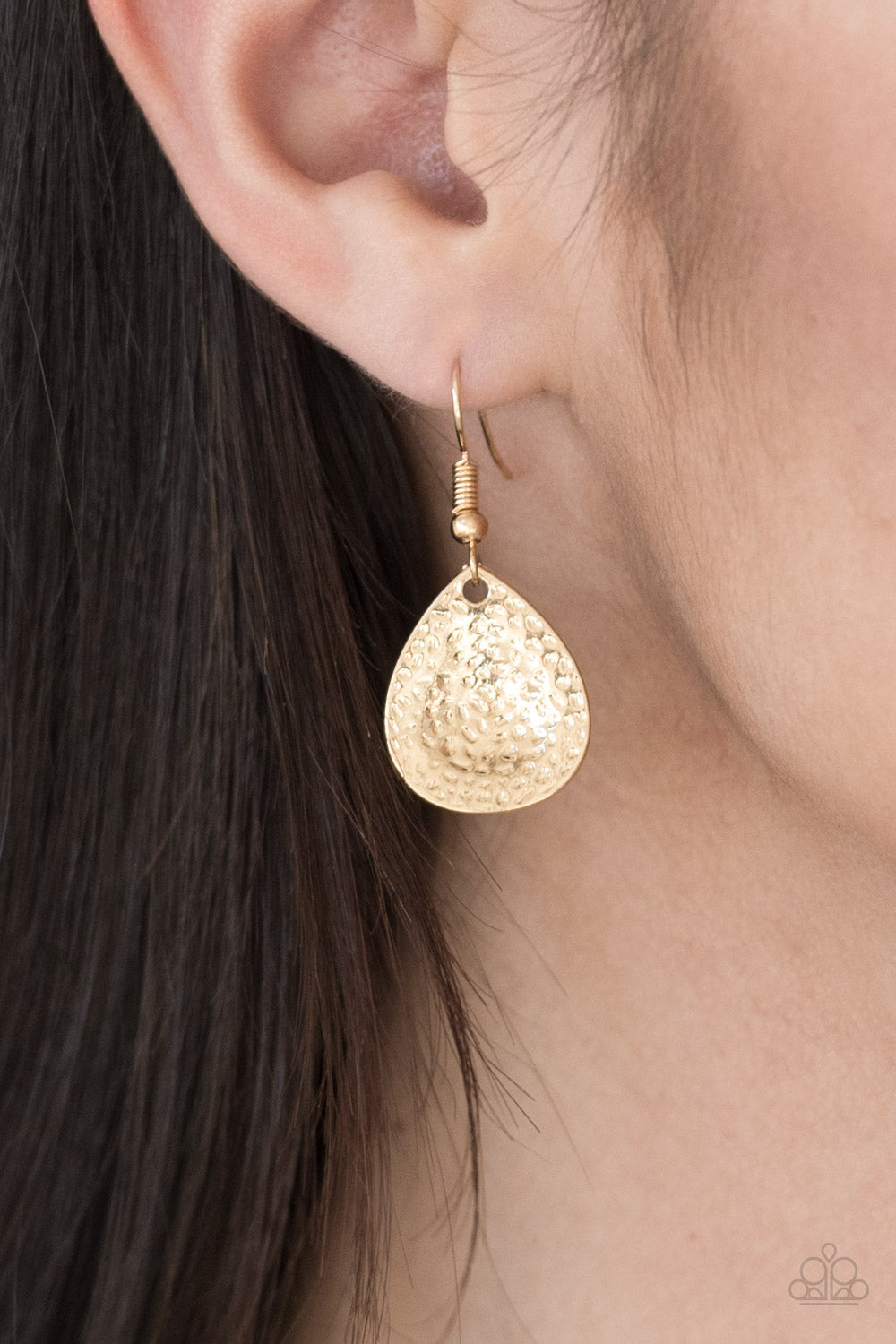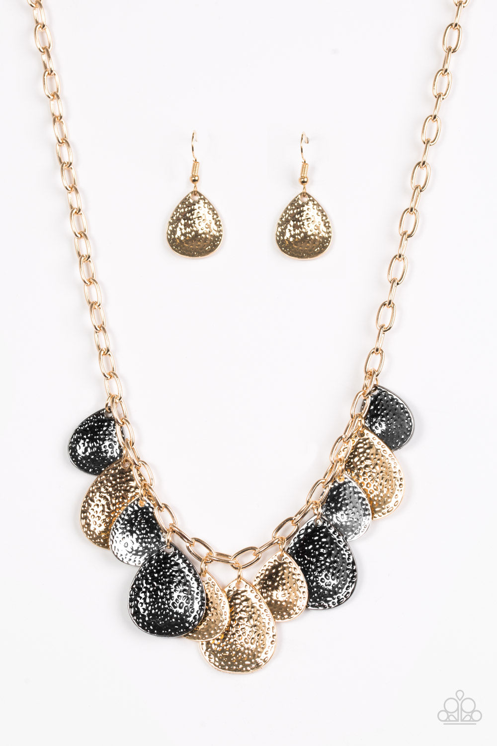 Delicately hammered in light-catching shimmer, gold, gunmetal, and silver teardrops drip from the bottom of a glistening gold chain, creating a bold fringe below the collar. Features an adjustable clasp closure.