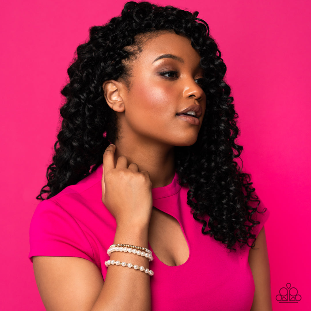 Classic white pearls, glistening gold beads, and a white crystal rhinestone are threaded along elastic stretchy bands, creating refined layers across the wrist.