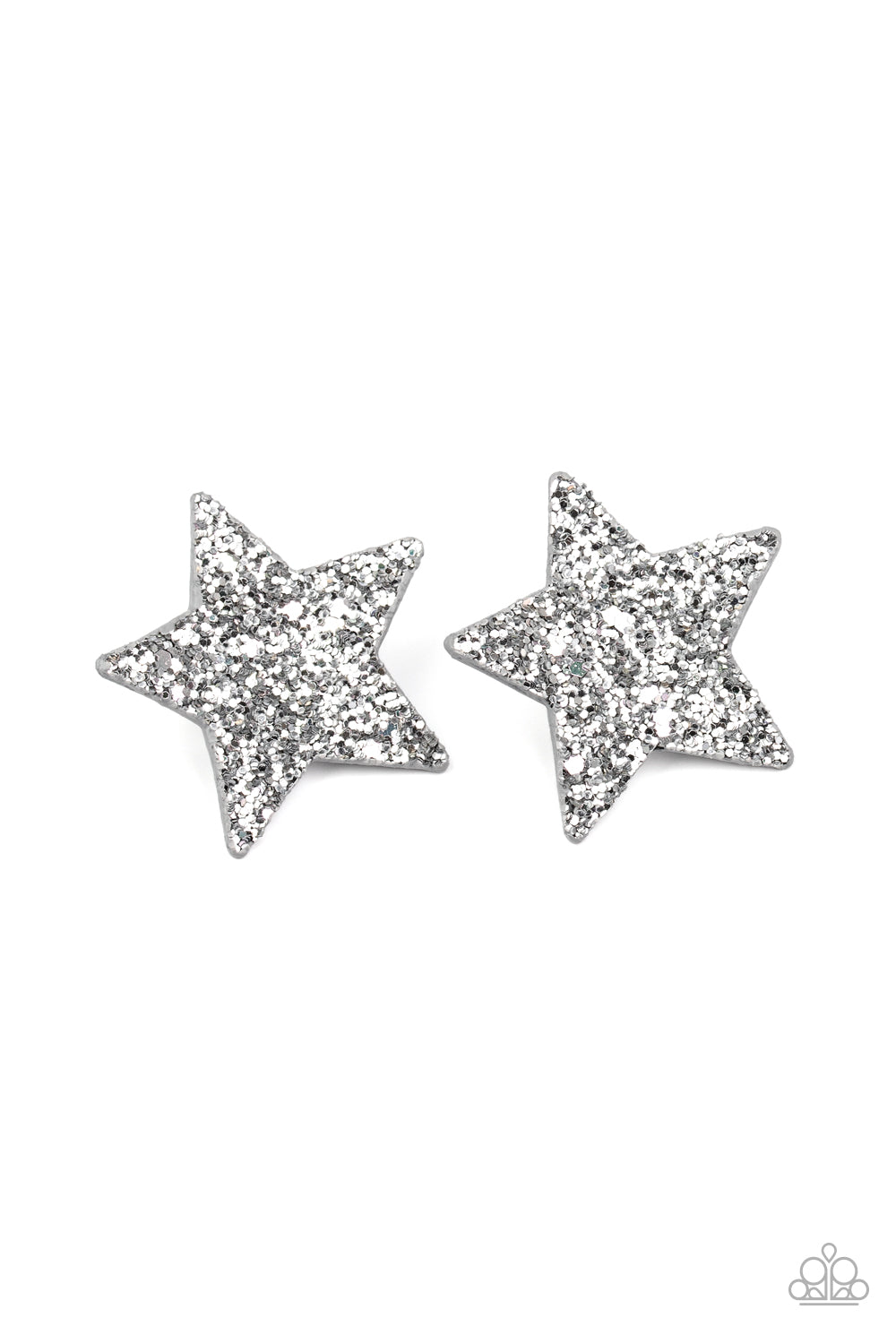 Sprinkled in glittery red sequins, a sparkling pair of stars are attached to clips on the back for a patriotic inspired fashion. Features standard snap clips.
