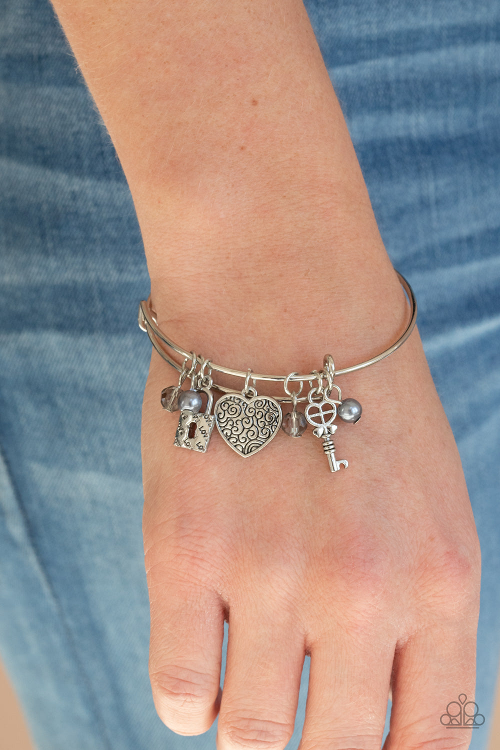 Infused with silver pearls and glittery white crystals, an antiqued collection of silver heart, key, and lock charms glides along a dainty silver bangle-like bracelet around the wrist.