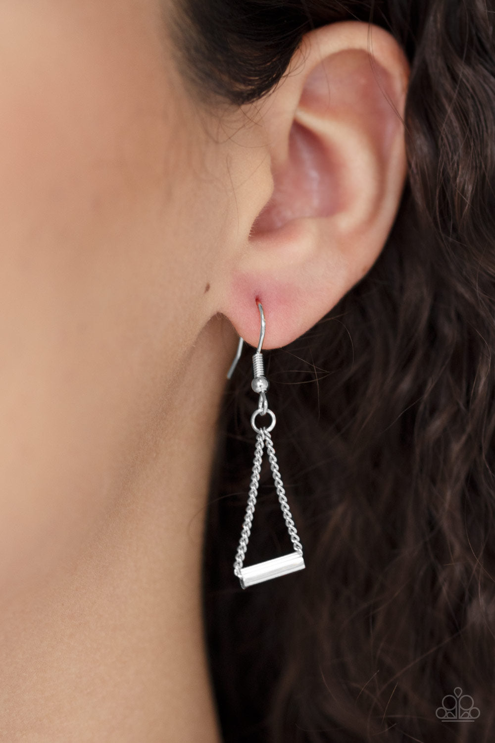 A collection of silver, gold, and gunmetal square rods slide along two dainty silver chains below the collar, creating edgy metallic layers. Features an adjustable clasp closure.