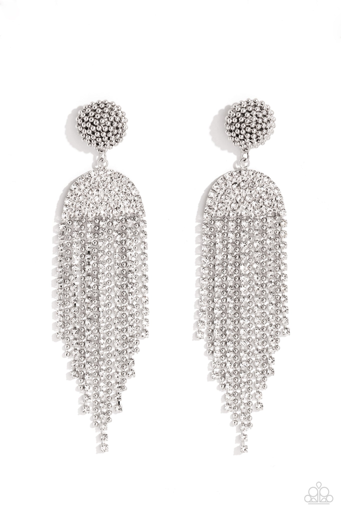 Strands of various glassy white rhinestones and dainty silver ball chains stream from a rhinestone-encrusted arched fitting, creating a timelessly tapered fringe. Silver ball chain seemingly wraps around the post in an infinite manner above the arched fitting, creating additional tactile detail. Earring attaches to a standard post fitting.