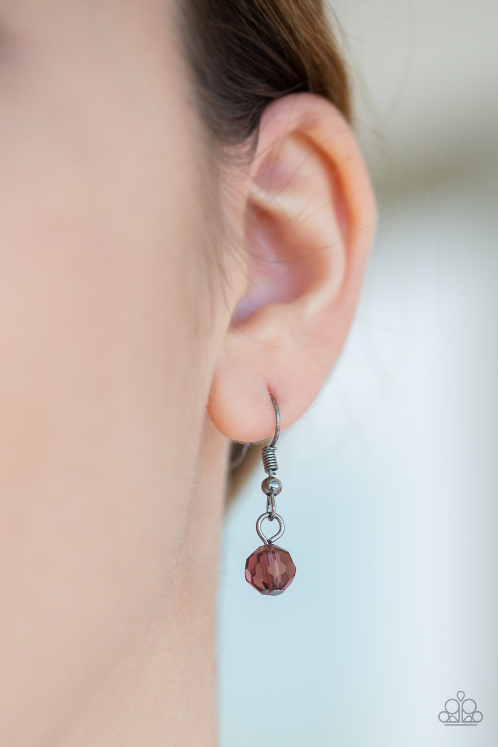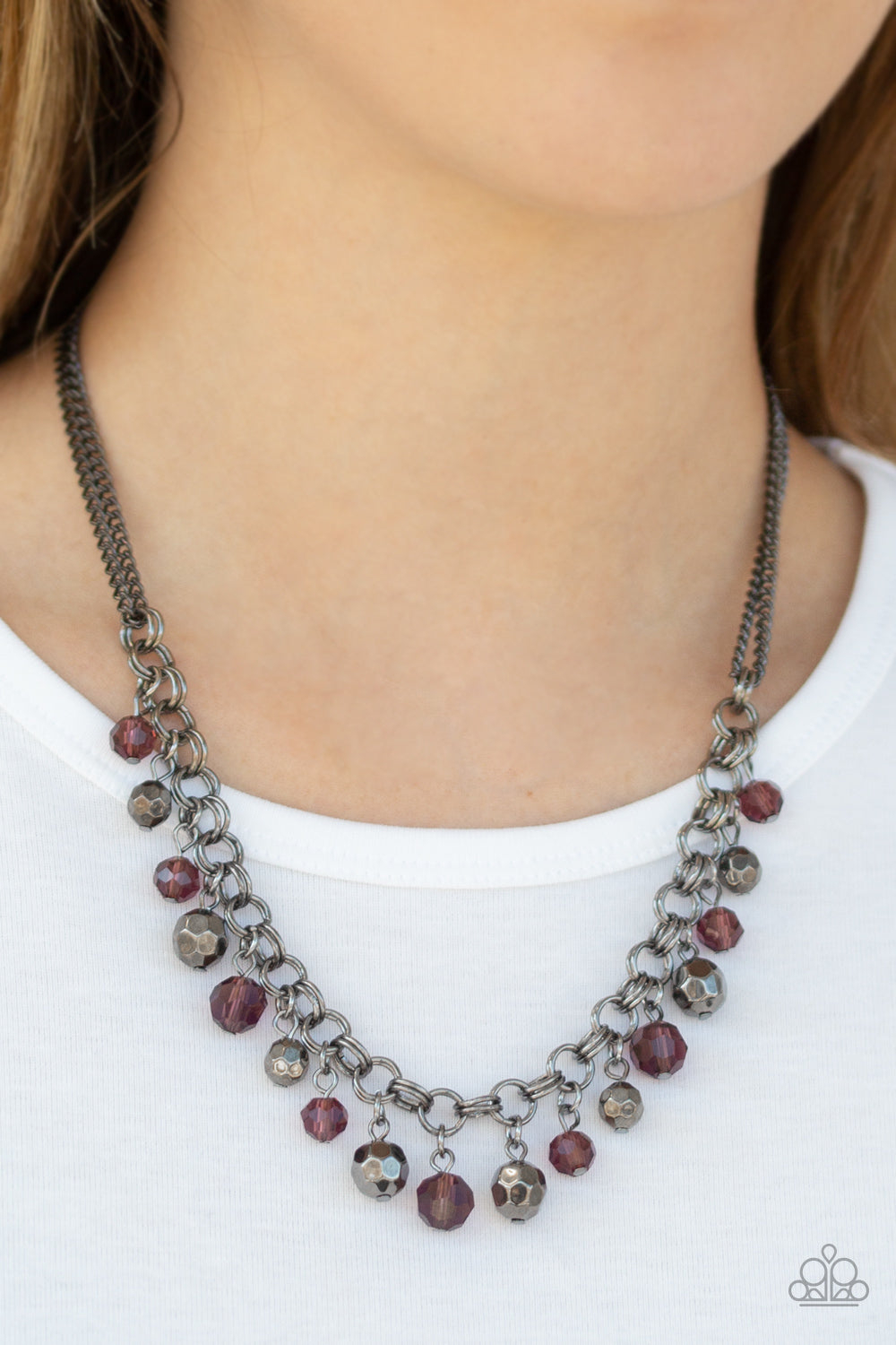 A collection of faceted gunmetal beads and purple crystal-like beads swing from the bottom of a double-link gunmetal chain, creating a blinding fringe below the collar. Features an adjustable clasp closure. Sold as one individual necklace. Includes one pair of matching earrings.