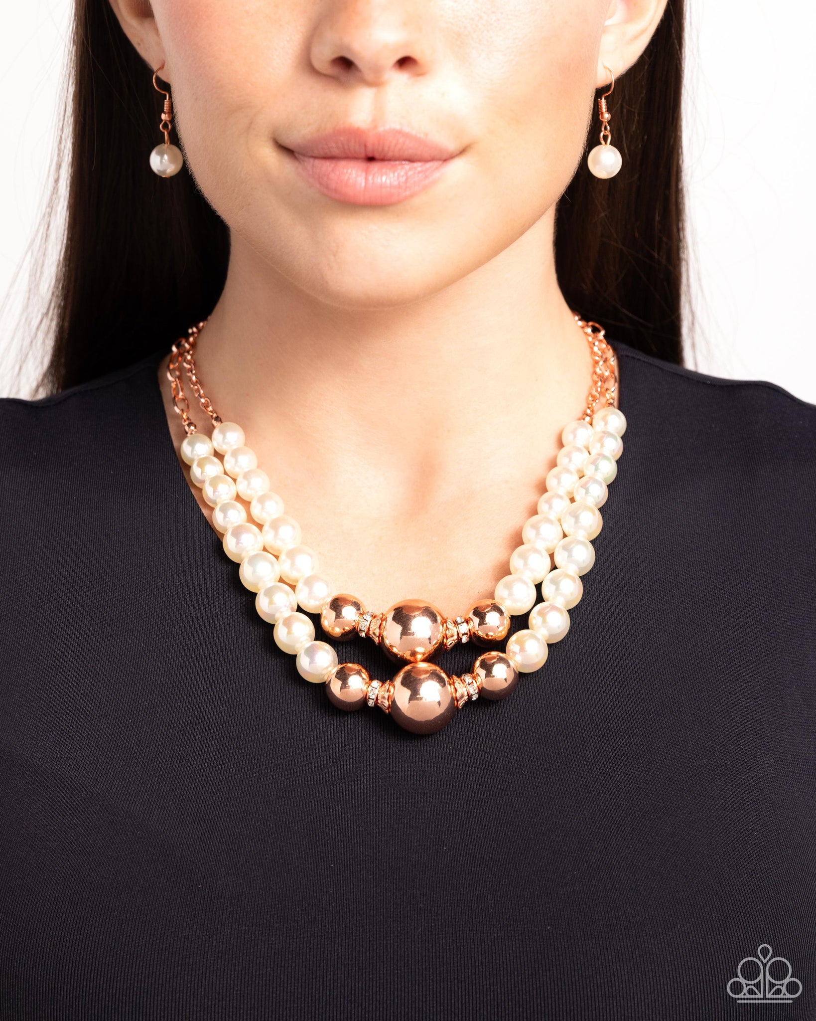 Infused along a shiny copper paperclip and classic shiny copper chain, a collection of glossy white pearls and high-sheen shiny copper beads in various sizes cascade around the collar in layers for an elegant display. Features an adjustable clasp closure.