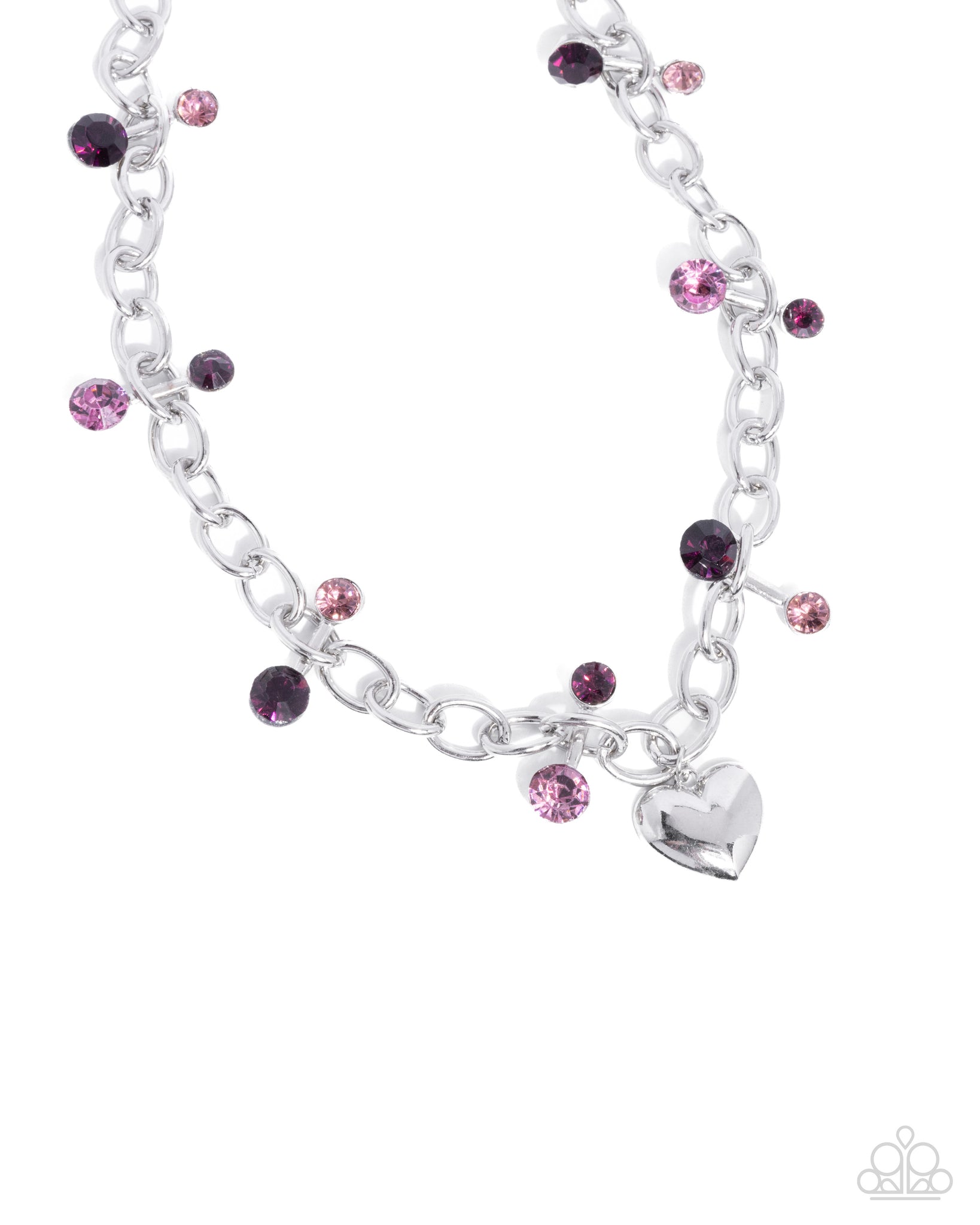 Sporadically threaded through the links of an oversized glistening silver chain, silver bars dotted with haphazardly sized amethyst, and light amethyst rhinestones alternate in direction along the neckline. A solitaire silver heart charm swings from the center of the display for a romantic finish. Features an adjustable clasp closure.