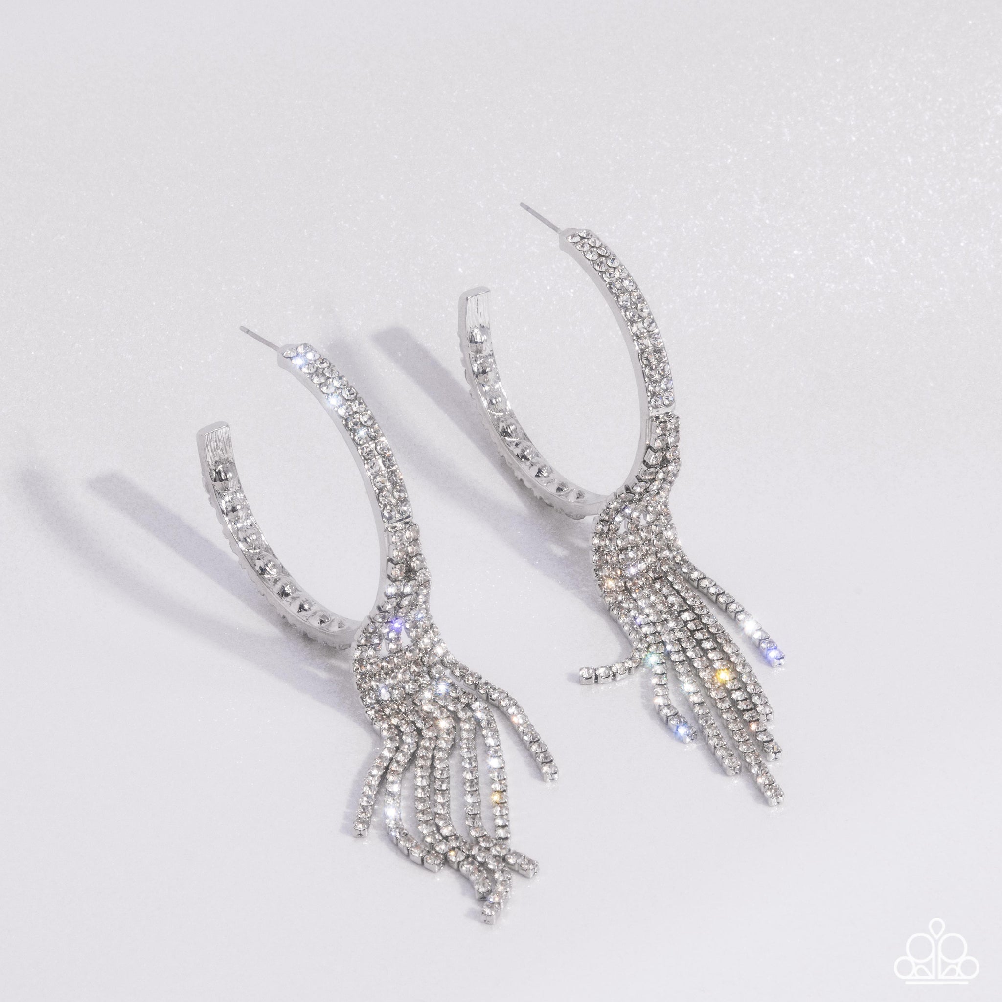 Set atop the front of a silver hoop, a doubled row of white rhinestones is embellished for a dazzling design. Strands of white rhinestones set in silver square fittings stream from the center of the hoop, creating an angled fringe, adding undeniable drama and eye-catching movement to the piece. Earring attaches to a standard post fitting. Hoop measures approximately 2 1/2" in diameter.